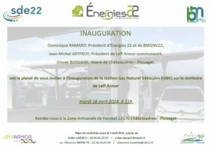 Dominique RAMARD, Président d’Énergies 22 et de BMGNV22, Jean-Michel GEFFROY, Président de Leff Armor communauté et Olivier BOISSIERE, Maire de Châtelaudren – Plouagat, ont le plaisir de vous inviter à l’inauguration de la station Gaz Naturel Véhicules (GNV) sur le territoire de Leff Armor.