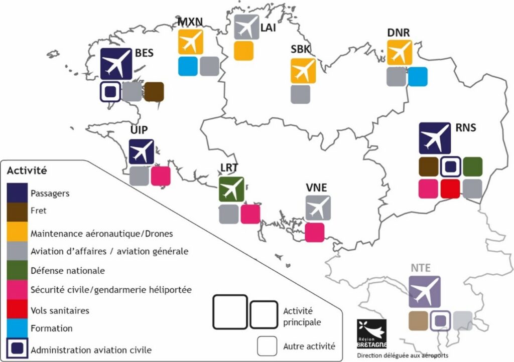 Les aéroports bretons combinent de nombreuses activités au service de leur territoire. C’est le cas des activités de sécurité civile et ses moyens héliportés sur les plateformes de Quimper et Lorient, de la sécurité incendie et le pélicandrome sur Vannes, le fret express aérien sur Rennes, l’industrie de maintenance aéronautique sur Dinard, Morlaix et Saint-Brieuc, la formation aux métiers de l’aéronautique à Morlaix, Dinard et Brest, sans oublier les activités de défense nationale sur Lorient, Rennes, et Vannes.