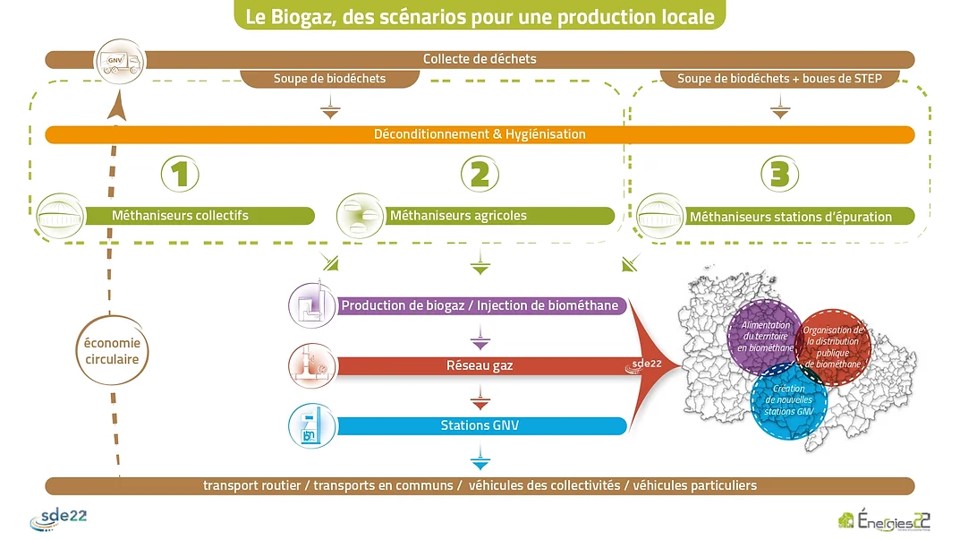 Le SDE22 mène également une réflexion autour de la création de circuits courts de biogaz et étudie la possibilité de créer des boucles d’autoconsommation collective de gaz vert. Pour le SDE22, il s’agira de contractualiser pour permettre les achats directs d’énergie entre des producteurs méthaniseurs locaux (agricoles, collectifs ou station d’épuration) et des consommateurs (stations GNV, collectivités…) situés dans un rayon maximum de 50 kilomètres.