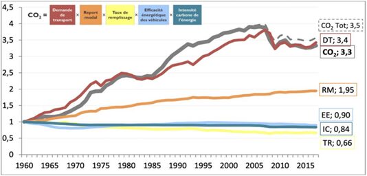 Ainsi, on peut lire que la demande de transport (DT) a augmenté les émissions de CO2 par un facteur de 3,4 entre 1960 et 2015. Ce coefficient est le plus impactant dans le calcul des émissions du transport de marchandises et est directement lié à une augmentation du trafic.