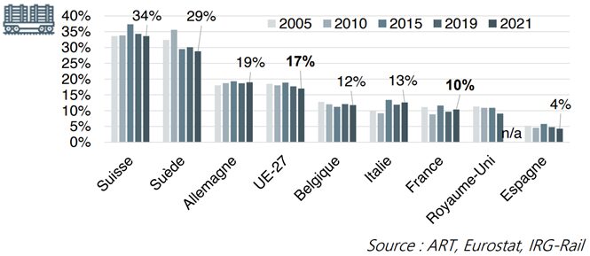 La part de marché du fret ferroviaire en France n’a cessé de s’éroder au profit du transport routier de marchandises, pour tomber à 10 % en 2021 contre 17 % au niveau européen.