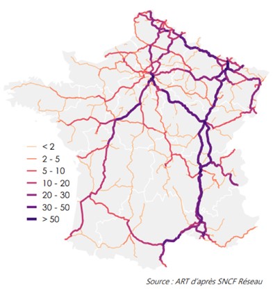 Près de 75 % des trains.km de fret sont réalisés sur les 6 500 km de lignes des corridors