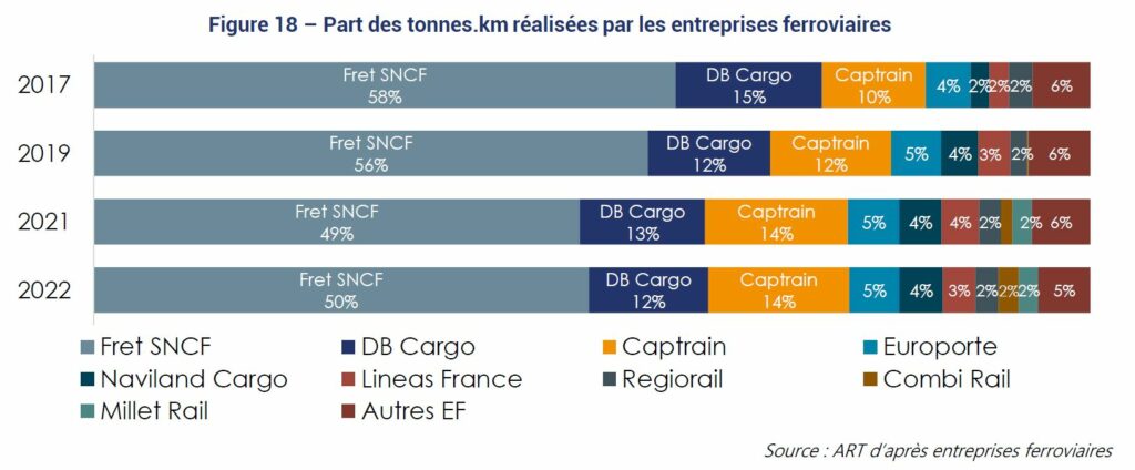 En France, le marché du transport ferroviaire reste concentré en 2022 : cinq entreprises ferroviaires réalisent 85 % des tonnes.km