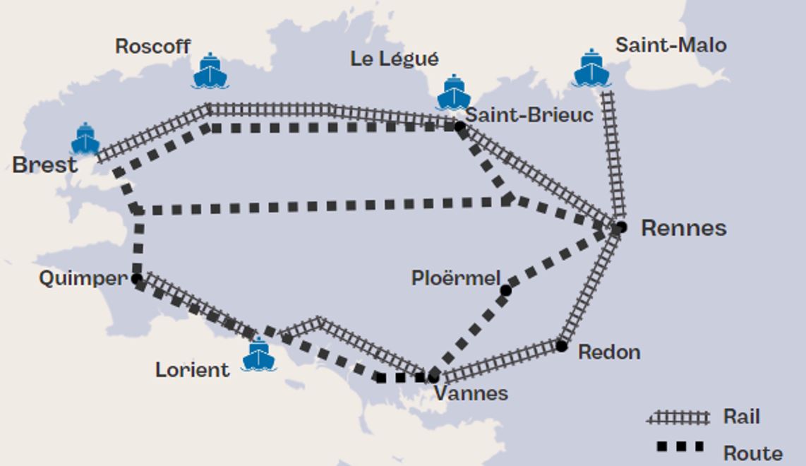 La Bretagne compte 5 ports de tailles moyennes et peu connectés aux lignes françaises, européennes ou internationales.